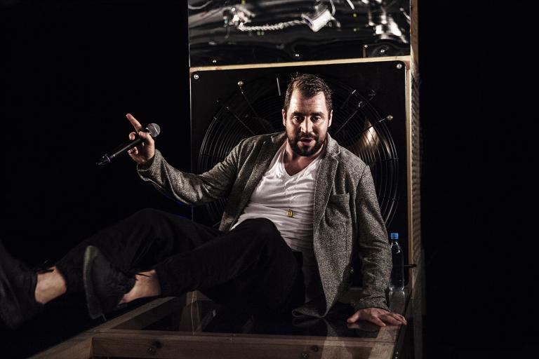 <p>Johannes Wanselow i Malmö stadsteaters föreställning "Jag, mig själv & min persiska pappa" på Studion.</p>