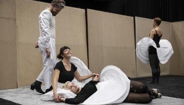 Skådespelarna övar sig i att bemästra krinolinerna. Vid premiären den 1 februari kommer de vara fullärda i denna konst!