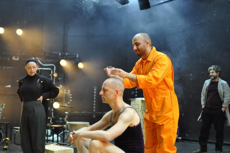 Skådespeleriet är coronaanpassat och ska så gott det går ske med en armlängds avstånd. Eftersom regissör och ensemble var tvungna att hela tiden tänka på att hålla avstånd påverkades en del av de konstnärliga besluten av detta. Begränsningar som många gånger faktiskt ledde till ett bättre slutresultat. Här testar Magdi Saleh att använda Erik Borgekes huvud som bardisk, utan att komma i direktkontakt med varandra. Med på scen är också Susanne Karlsson och Erik Olsson.